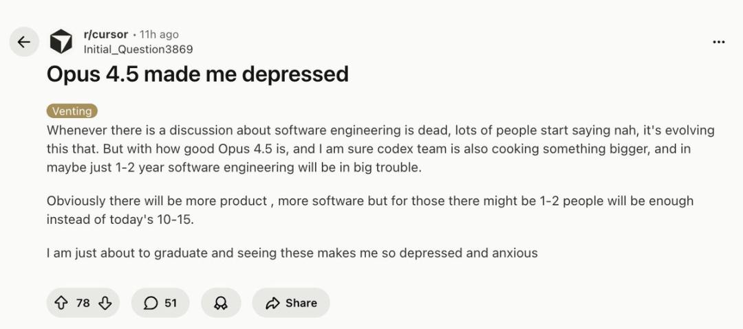 不过,对于毕业生而言,在这种历史大潮下最是焦虑,Opus 4.5甚至让相关专业的准毕业生感到「非常抑郁和焦虑」: