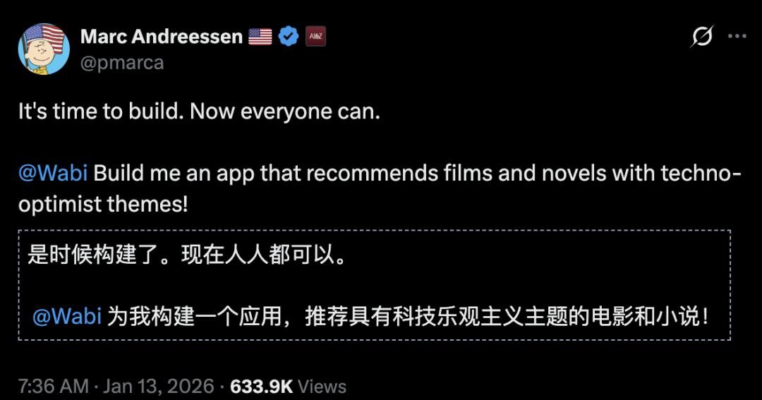 - a16z创始人Marc用Wabi造出了一套techno-optimist(技术乐观主义)风格的电影和小说推荐系统;