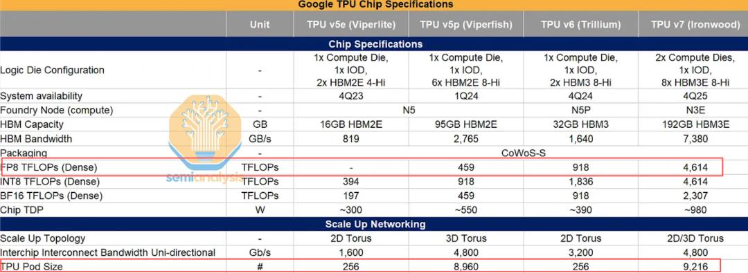 ▲Google TPU v5e、v5p、v6、v7芯片关键性能对比(图片来源:SemiAnalysis)