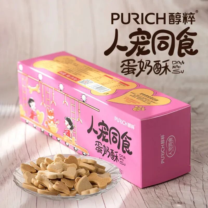 醇粹官网介绍称,该系列均由人类食品工厂生产,采用了食品级原料,根据宠物的营养需求研发,品质兼顾营养与口味。醇粹“人宠同食”系列零食包括芝士脆、蛋奶酥、棒冰粉、西餐火腿,部分产品包装上印上了“你一口,我一口”。