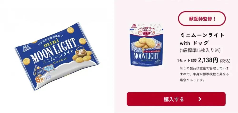 左边为人吃的Mini Moonlight,右边为“withドッグ”系列的Mini Moonlight 图片来源:森永制菓官网