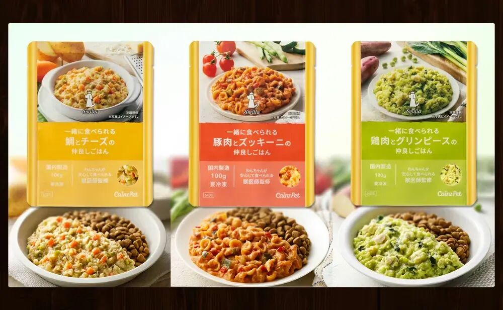 Cainz一共推出了3款产品:一款是西葫芦猪肉,用6种蔬菜搭配猪肉,做成番茄基底的短通心粉;一款是青豆鸡胸肉,用青豆和红薯加入甜味,做成更温和的烩饭口感;还有一款是芝士鲷鱼,选用鲷鱼和蔬菜做成大麦烩饭,并用芝士与鱼片提香。这些产品单份100g、含税398日元(约为17.6元人民币),官方宣传图片则着重展示这些产品搭配狗粮的效果图。[3]