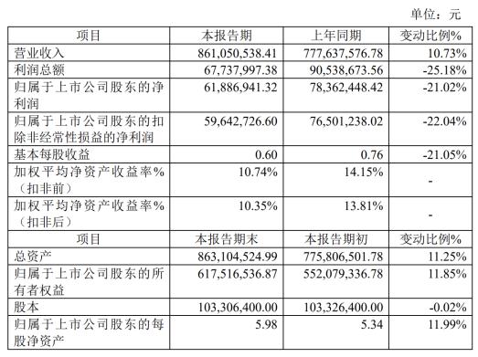 财报显示,2025财年,路斯股份实现营业收入8.61亿元,同比增长10.73%;归属于上市公司股东的净利润(归母净利润)仅为6188.69万元,同比下降21.02%;扣除非经常性损益后的净利润约5964万元,同比下降22.04%。