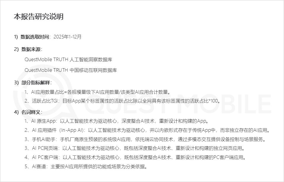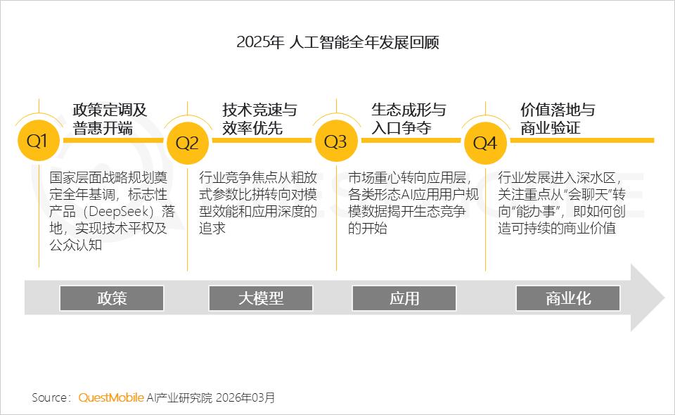 因此,2025年无愧“AI应用元年”的称号!这当中,移动端AI应用、手机厂商AI助手的月活规模在整体用户大盘中的占比已经分别达到56.6%、57.7%,这个速度已经远超过互联网历史上的任何一次新技术落地的状况。这背后,更显著的产业变化包括:每个季度都有标志性事件发生,如开源普惠、效能比拼、生态入口争夺、商业价值落地等等;多场景、全链路的应用穿透,创作设计、综合助手、效率办公、文案写作、开发平台等赛道应用占比分别达到11.7%、10.7%、9.2%、8.7%、8.1%。