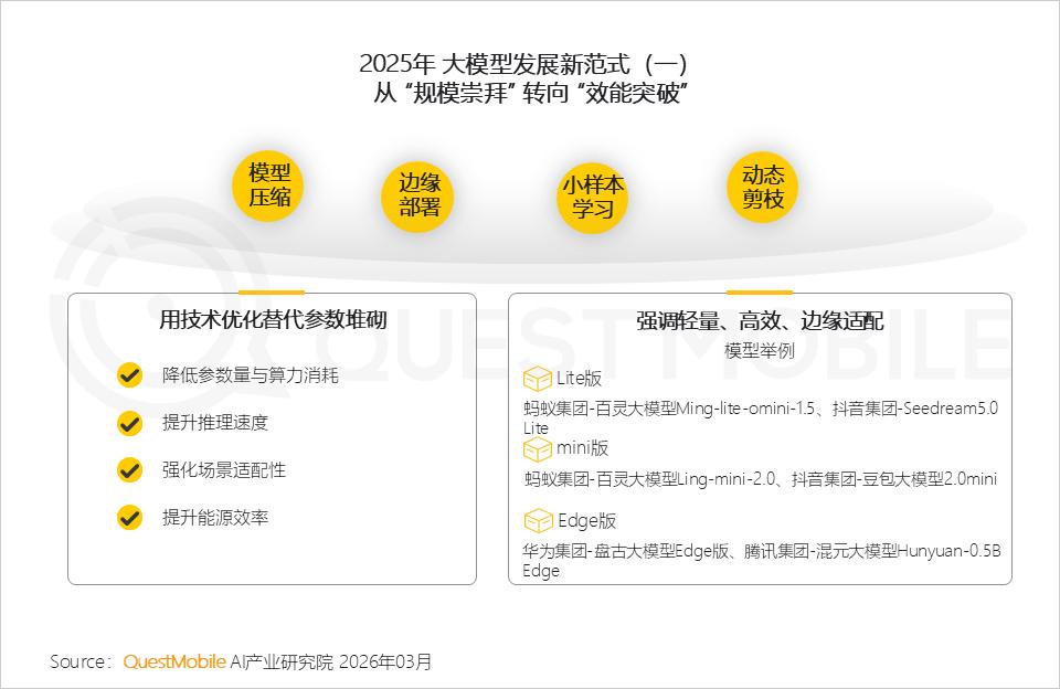 2、首先,技术上更重视模型的实际运行效率和场景适配性;轻量化的突破是AI具备大规模普及的先决条件