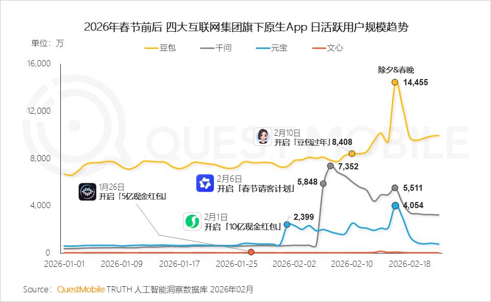 此次阿里、百度、抖音、腾讯合计投入超过80亿元;QuestMobile数据显示,豆包以8400万日活开局,并于除夕&春晚当日直冲高峰,DAU达1.45亿;千问于活动次日攀至高峰,DAU达7352万;元宝除夕当日DAU达4054万。