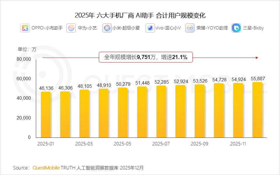 QuestMobile数据显示,自2025年01月起,六大手机厂商AI助手规模合计增长9751万,全年增长21.1%。