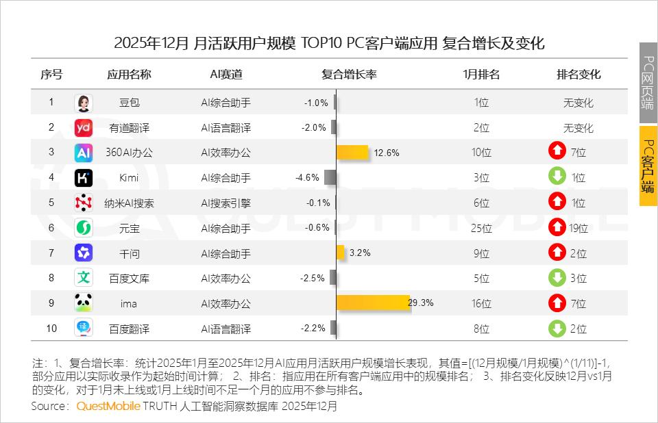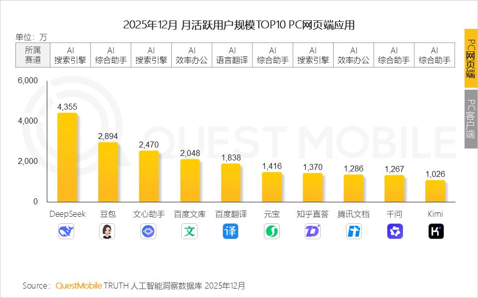 5、 除豆包外,其余上榜的PC客户端应用规模较为接近,均在百万量级,充分说明当前市场处于早期,格局尚未固定,未来变数较大