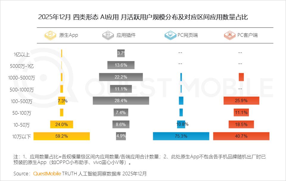 网页应用、插件形态应用及手机厂商AI应用以“无下载门槛”优势,成为推动AI普及的重要入口;原生App则定位于深度体验;QuestMobile数据显示,2025年12月,原生App,应用插件,网页端和客户端应用数量占比分别为20.0%、27.2%、49.8%以及3.0%。
