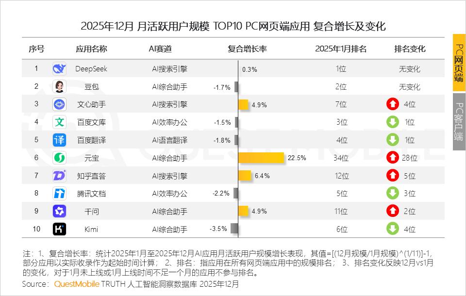 QuestMobile数据显示,元宝、千问、文心助手的网页端应用复合增速分别为22.5%、4.9%及4.9%。