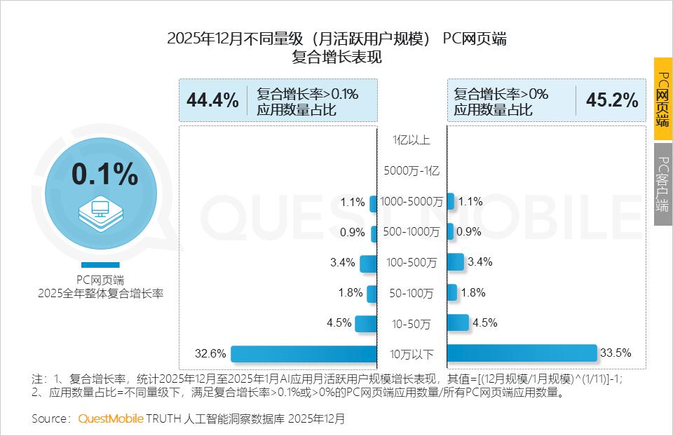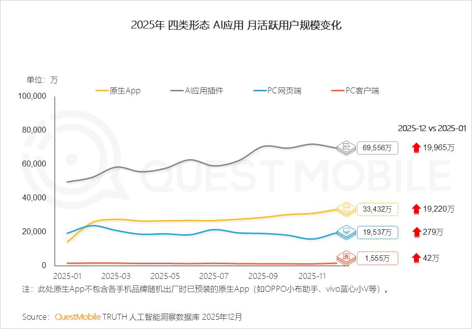 QuestMobile数据显示,2025年12月,原生App月人均使用次数较1月提升80.1%,应用插件提升229.8%,PC网页端和客户端分别提升54.9%和33.1%。