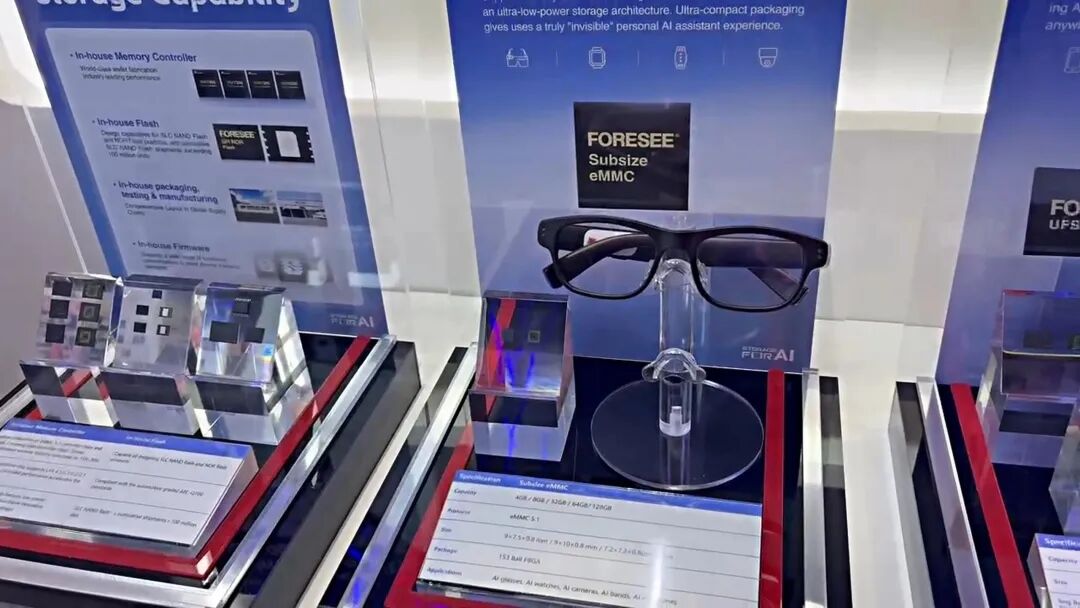 这次江波龙展示的ePOP5x,是专为AI眼镜等穿戴设备设计的高性能小体积存储,DRAM传输速率达8533Mbps,为上一代的2倍,封装厚度最薄可至0.52mm。