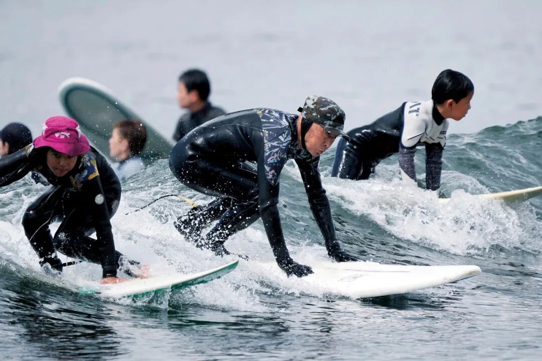 2023年3月30日,日本藤泽。89岁的日本男子佐野诚一(中)与年轻的冲浪者一起在片濑西滨海滩冲浪,他被吉尼斯世界纪录认定为最年长的冲浪男性。(图/CFP)