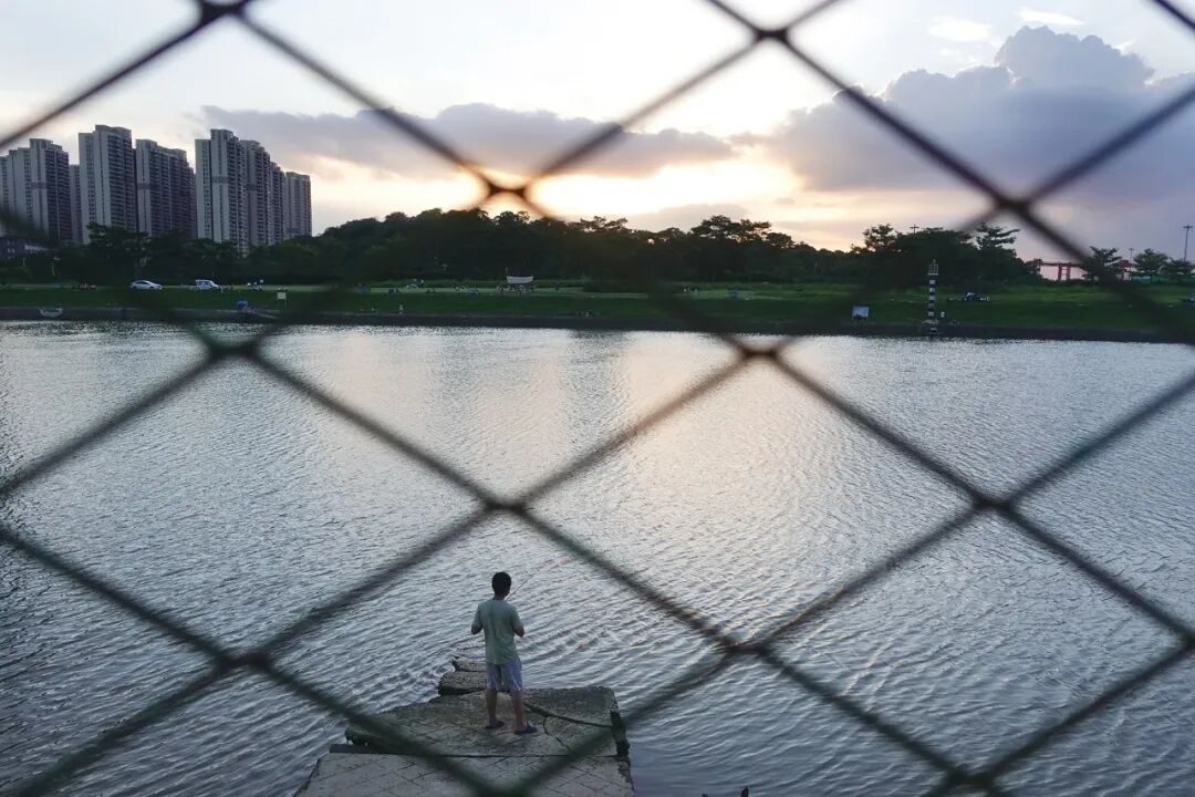 2023年9月17日,广东广州。黄昏时分,一名男子独自在江边钓鱼。照片中的人恰好落在菱形网格之中,形成对当代生活的一种隐喻。(图/苏峥)