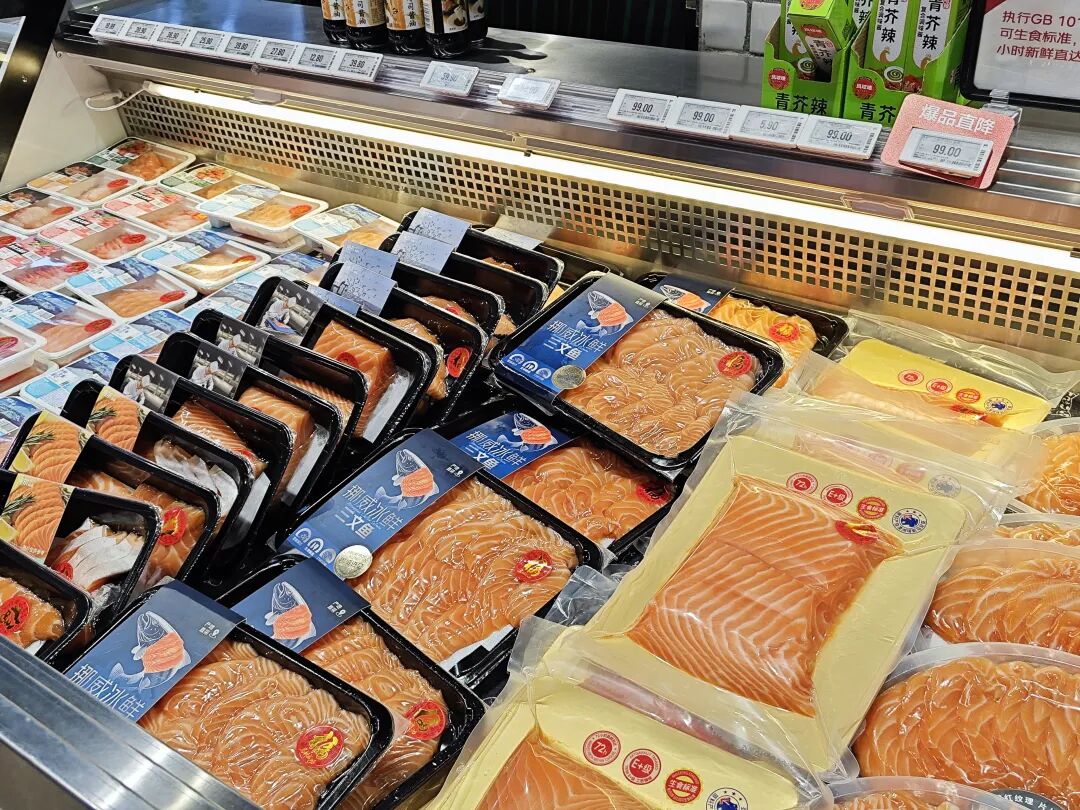 特别近两年,也是三文鱼在中国零售市场最风光的时候。各大平台主动把三文鱼当引流品来做,商超里刺身柜台成了标配,来自挪威、智利、澳大利亚、法国的各类产品把货架铺得越来越宽。