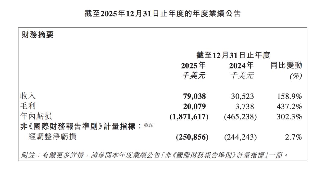 财报显示,MiniMax 2025 年营收同比增长 158.9% 至 7903.8 万美元,毛利同比增长 437.2% 至 2007.9 万美元。但同期 MiniMax 亏损同样增幅显著,年内录得亏损约 18.72 亿美元,同比扩大 302.3%。