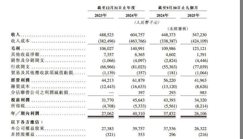 报告期内,公司收入由2023年的4.885亿元增加23.8%至2024年的6.048亿元,并由截至2024年9月30日止九个月的4.484亿元增加22.0%至截至2025年9月30日止九个月的5.472亿元。