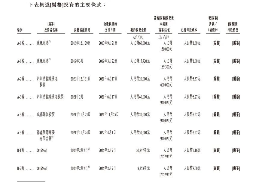 IPO前,公司累计完成了8轮融资,主要投资方包括达风私募、四川省健康养老投资、成都锦江投资、德鑫智慧康养有限合伙以及奥博资本(OrbiMed)。