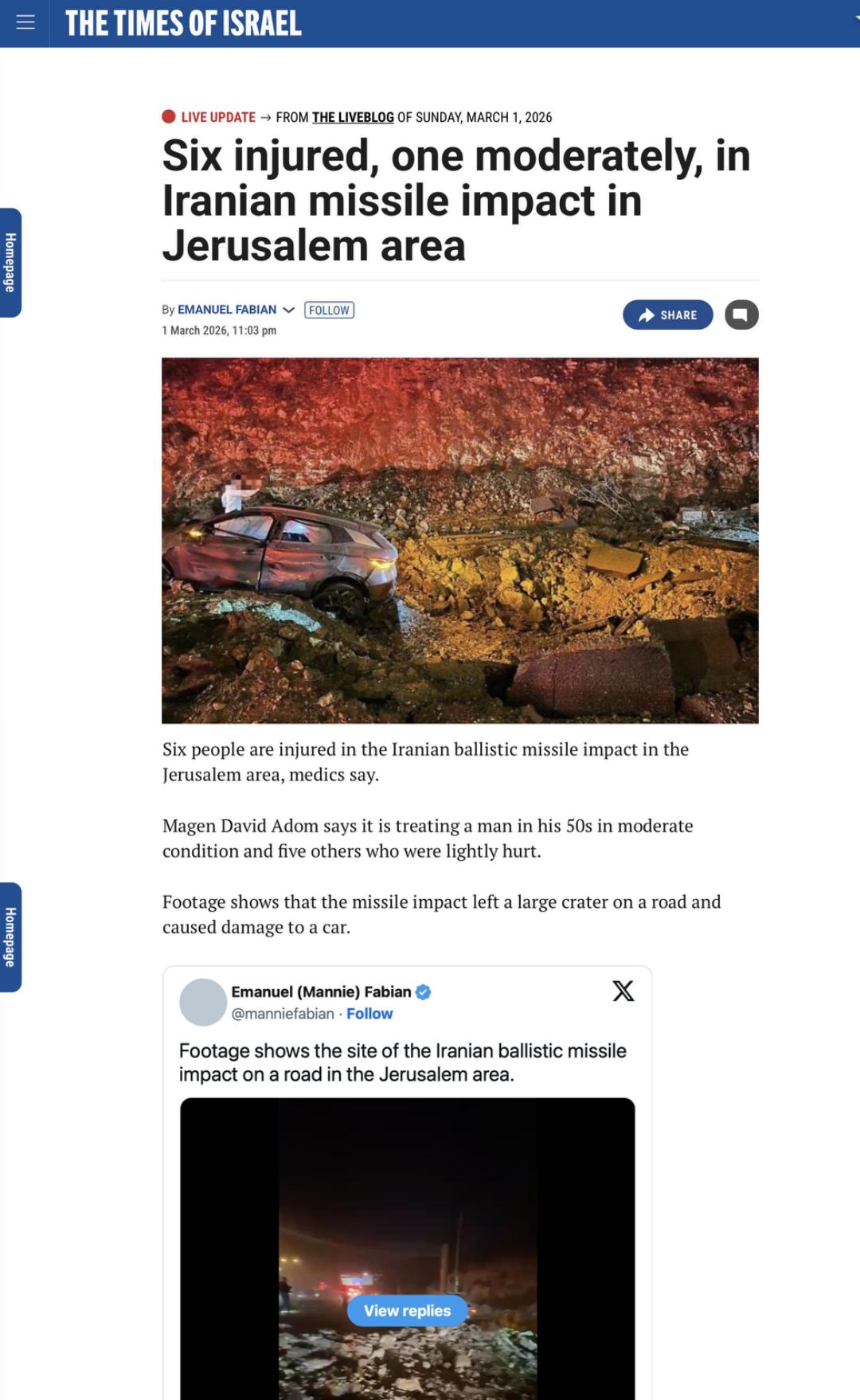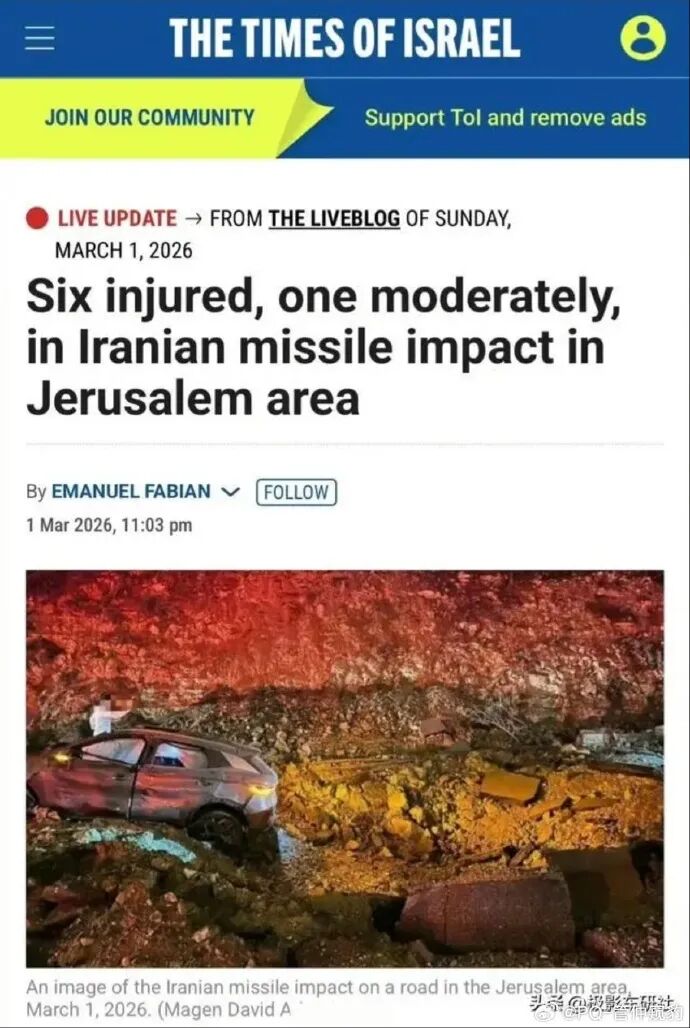 标题是《Six injured, one moderately, in Iranian missile impact in Jerusalem area》(伊朗6人受伤,1人中度在耶路撒冷地区被伊朗导弹撞击)。