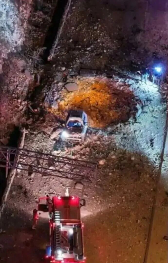 录像显示,导弹撞击在道路上留下了一个大坑,并损坏了一辆汽车。