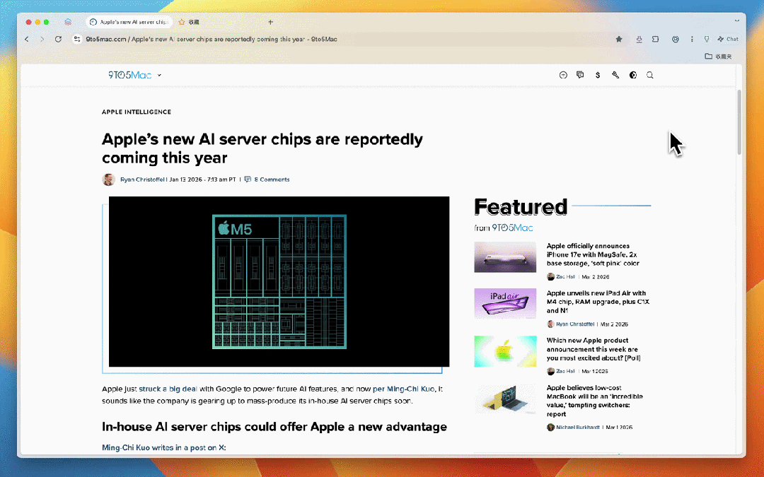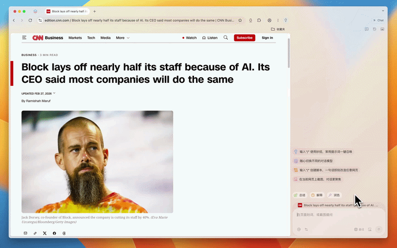 大多数人使用 AI 的方式都很割裂,在浏览器里读到一篇文章,想让 AI 总结或追问,只能手动复制粘贴,切换到另一个 AI 应用。这种操作每天发生很多次,每一次都打断当前的阅读思路。
