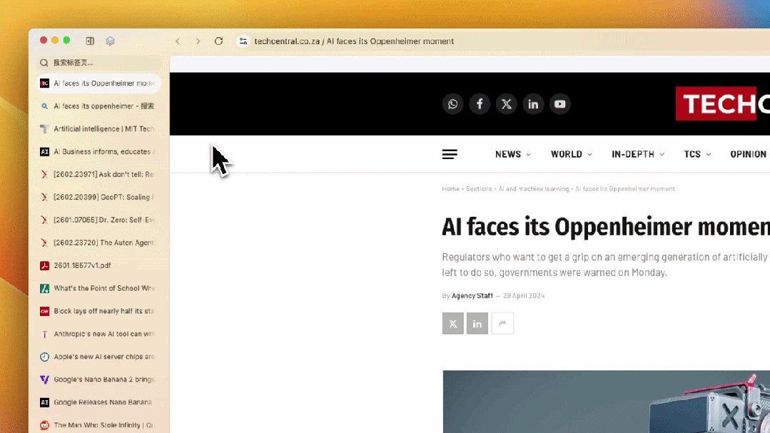 Tabbit 的垂直标签栏将所有标签页在左侧纵向排列,即便打开数十个页面,每个标签的完整标题依然清晰可见。