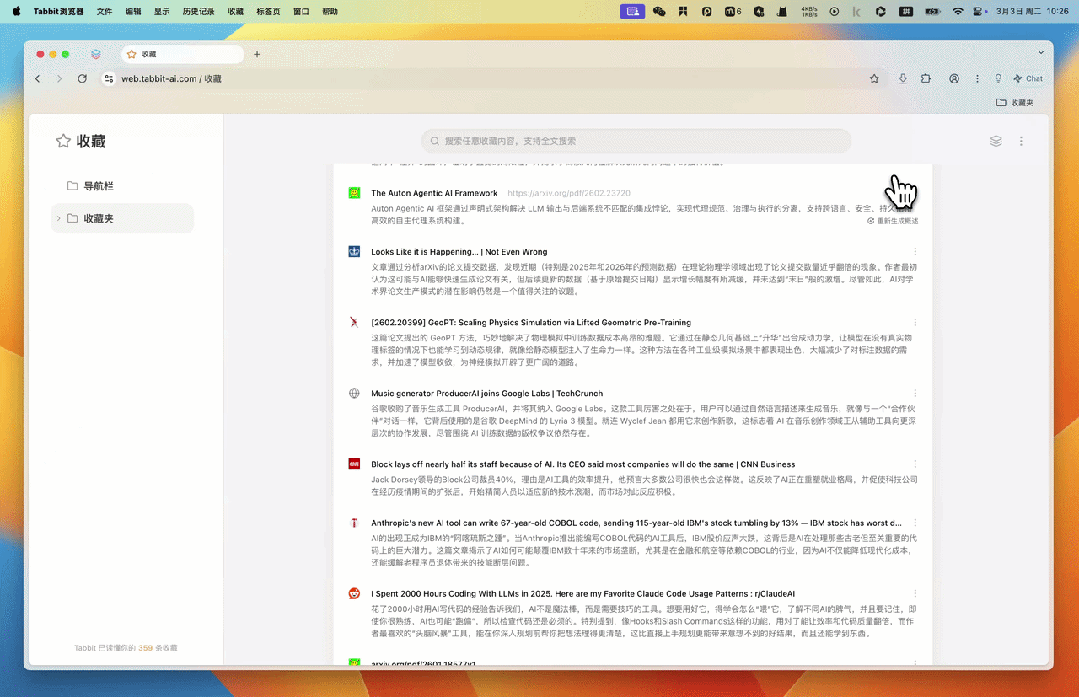 Tabbit 的收藏功能不只保存链接,还完整保存网页内容,并由 AI 自动生成摘要,我们无需点开就能快速回顾核心信息。
