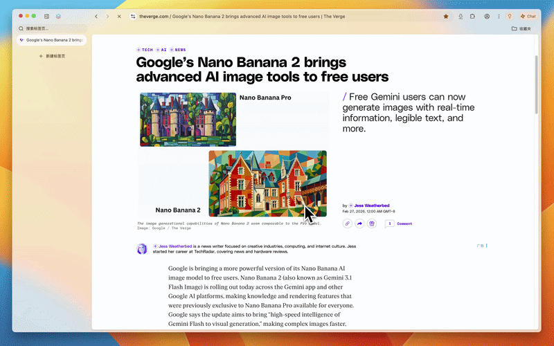 比如让它总结 The Verge 一篇关于「谷歌推出 Nano Banana2」的报道,Tabbit 思考片刻后,便整理出文章的核心主旨、关键要点与结论建议,条理清晰,让人在最短时间内掌握报道主要内容。