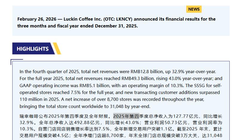 表面上看,2025年,瑞幸咖啡营、利双增,实现总净收入492.88亿元,同比增长43%;归母净利润达36亿元,同比增长21.8%。