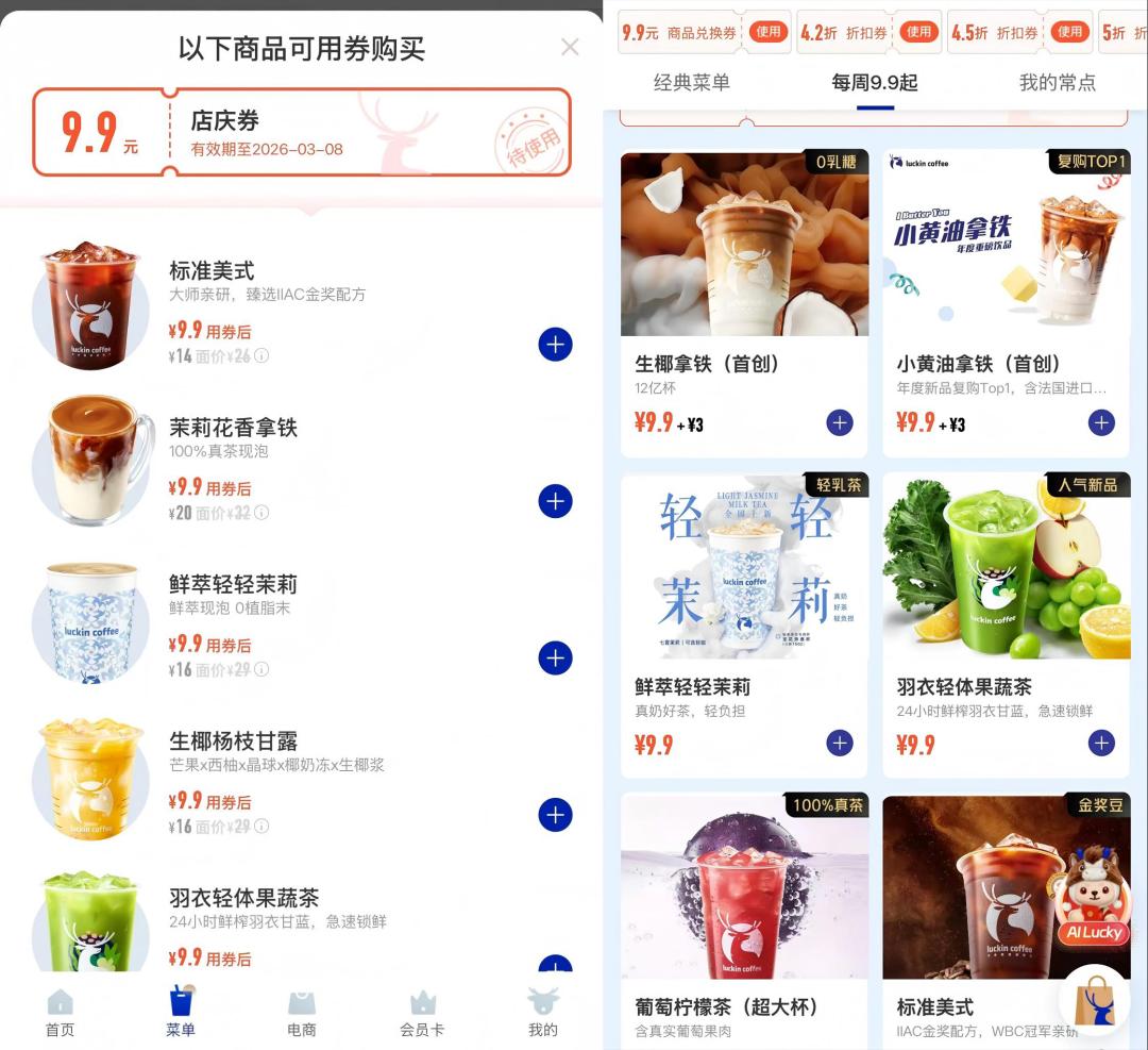 而现如今再点开瑞幸咖啡的小程序,9.9元的店庆券仅能适用于六款产品,分别是标准美式、茉莉花香拿铁、燕麦拿铁、鲜萃轻轻茉莉、生椰杨枝甘露和羽衣轻体果蔬茶。