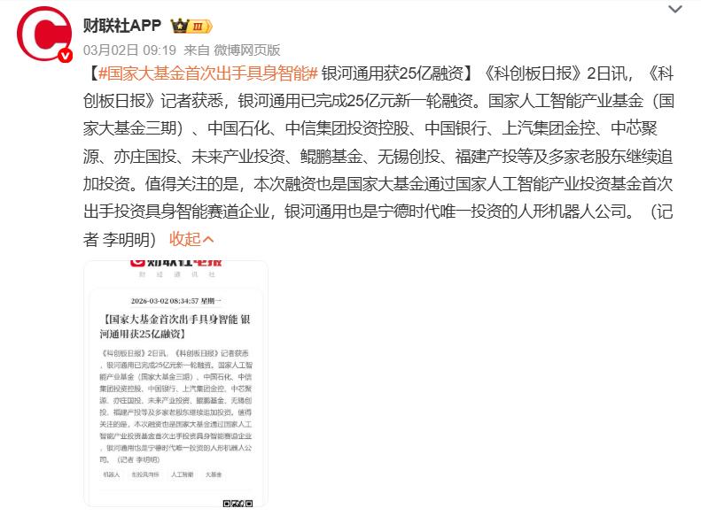 3月2日,登 上2026 马年央视春晚舞台的人形机器人企业松延动力和银河通用同日宣布完成新一轮融资。