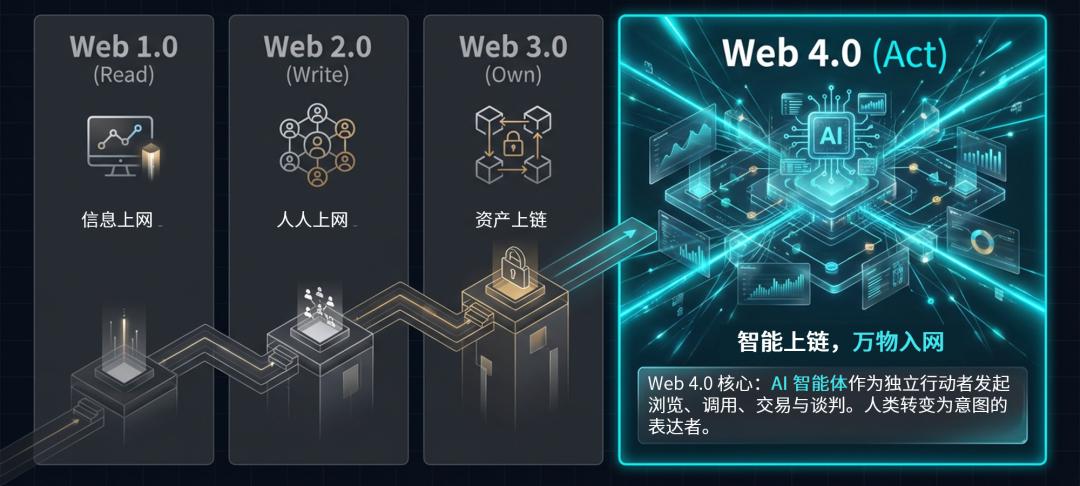 而我选择的指路坐标,是一个2026年春天突然引爆的概念:Web 4.0,互联网从Read到Write到Own再到Act。