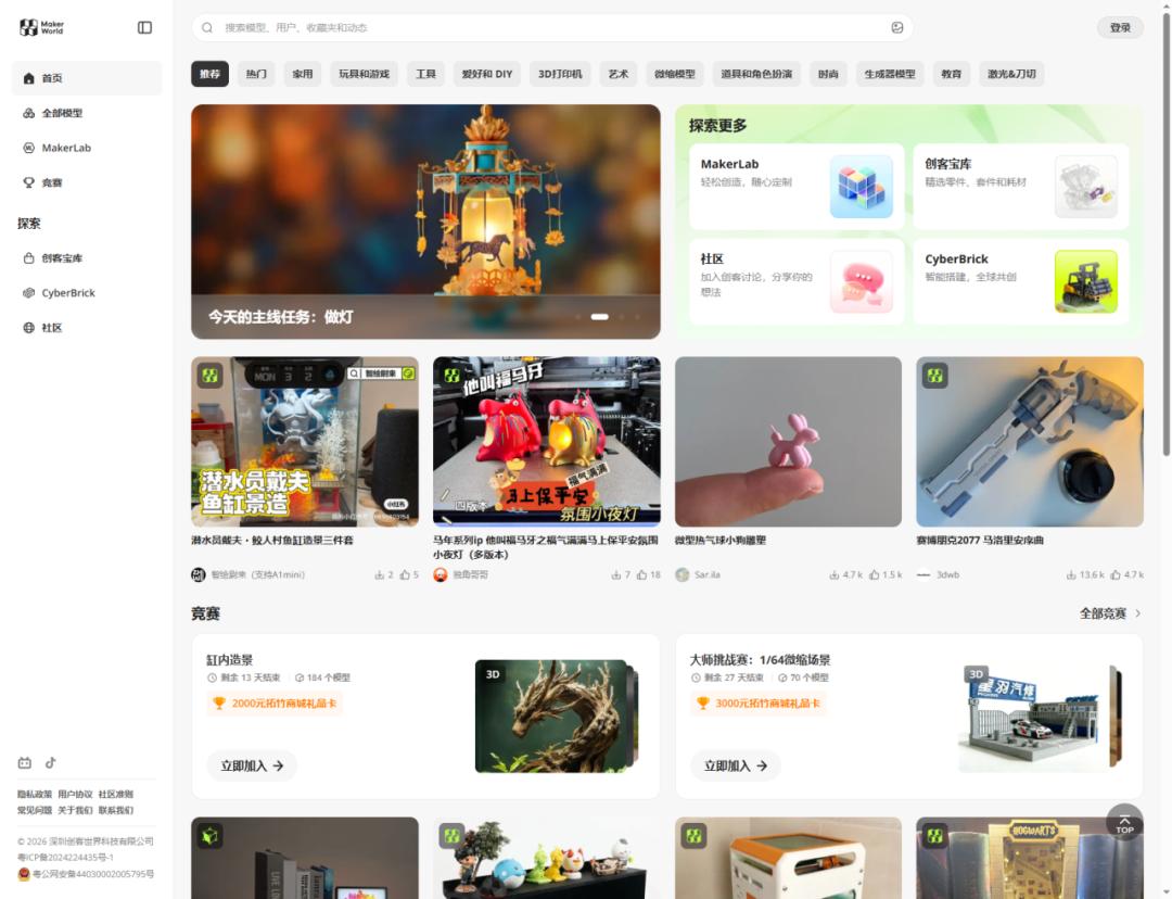 拓竹的成功,离不开其精心打造的“内容护城河”——MakerWorld 模型社区,这是一个全球3D打印爱好者的“乌托邦”,创作者在上面免费分享自己设计的模型,普通用户只需一键下载,就能在拓竹的打印机上“变出”实物。
