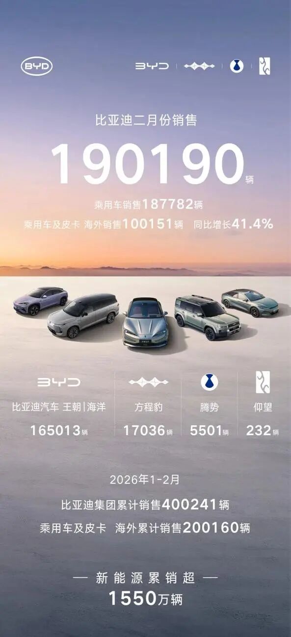 在判断汽车市场销售热度时,我们已经习惯于先看比亚迪和吉利这两家巨头的表现。他们在国内和海外市场都有建树,在一定程度上可以成为中国汽车市场的风向标。可以说,在如今以及未来很长一段“存量竞争”的时间段内,他们两家的防御能力决定了整体市场的下限。比亚迪在2月交出了19万辆的成绩单,其中乘用车销量18.9万辆(纯电79,539辆,插混108,243辆),而海外销售也达到了100,151辆。就此,比亚迪在今年的销量已超过40万。这种规模效应带来的不仅是供应链端的绝对议价权,更给到比亚迪在2026年继续在各方面挤压对手生存空间的底牌。王朝与海洋网的庞大用户基数,比亚迪、腾势、方程豹以及仰望的全价位品牌,这系列的完整布局都稳稳控制着市场的流量入口,为他们应对竞争带来更多策略选择。