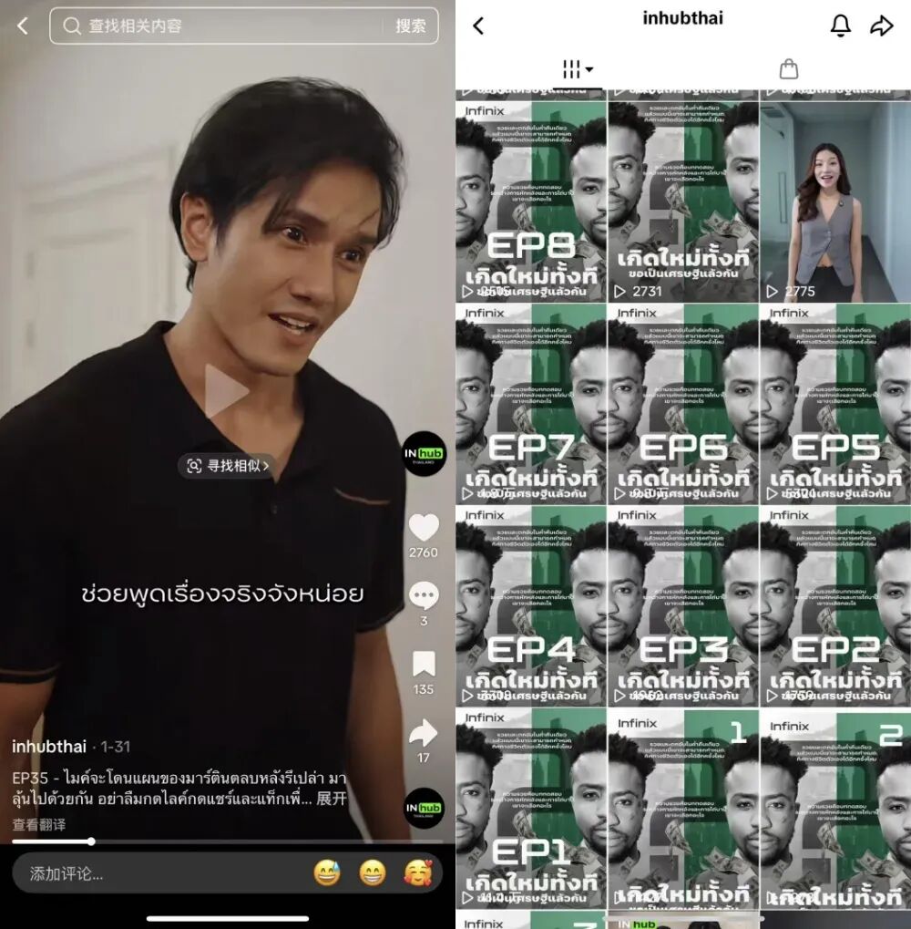 李杰发现,泰国影视作品中就有很多喜剧桥段,因此如果在短剧情节紧张时加入一些搞笑梗,那集的播放量就会明显变高。