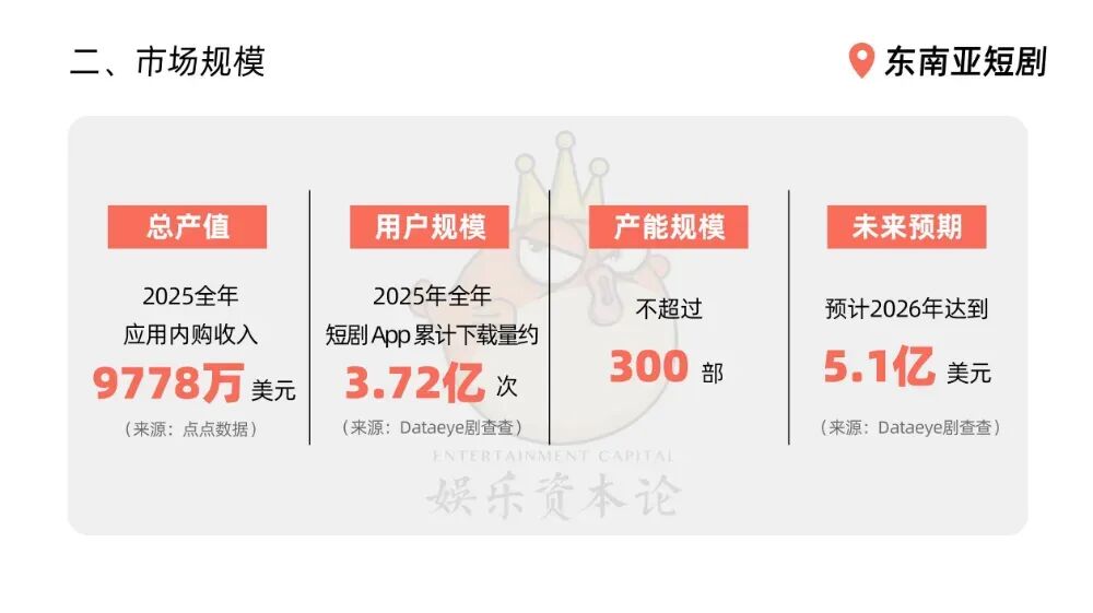 Dataeye数据显示,2025 年,东南亚微短剧产业规模已突破3.9亿美元,预估2026年将达到5.1亿美元,APP下载量高达3.72亿次,成为全球短剧市场增长最快的区域之一。这里既有短剧APP下载量全球第二的印尼市场(第一是中国),也有APP内购收入跻身全球前十的泰国市场。
