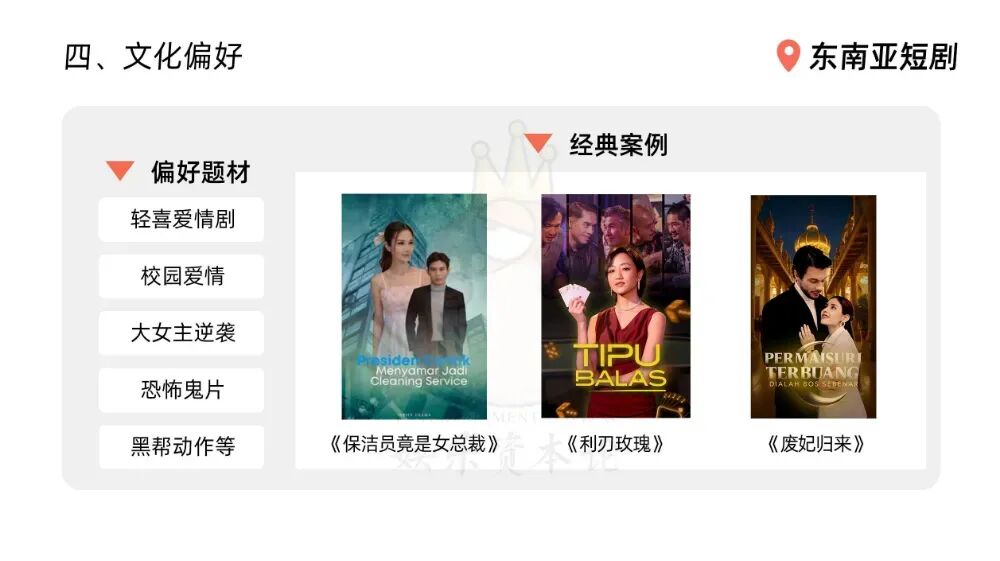 易漾光橙主要发行译制剧,杨柳发现,东南亚短剧受众以18-35岁年轻女性为主,因此爱情喜剧、甜宠、古装以及大女主爽剧在东南亚市场更受欢迎。特别是东南亚市场对青春校园剧需求旺盛,但国内产能不足,只能依赖本土原创。