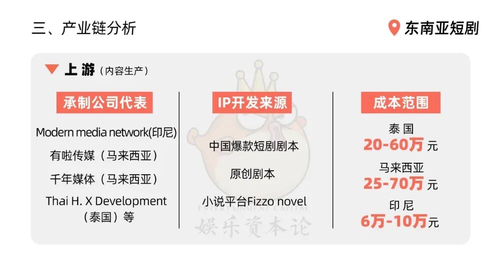 东南亚国家众多,不同国家的本土剧承制费也有差异,据小娱了解,泰国是100-300万泰铢,合计人民币20-60万,马来西亚15-40万马币,合计人民币25-70万,印尼最低,人民币6万-10万左右就能拍一部。