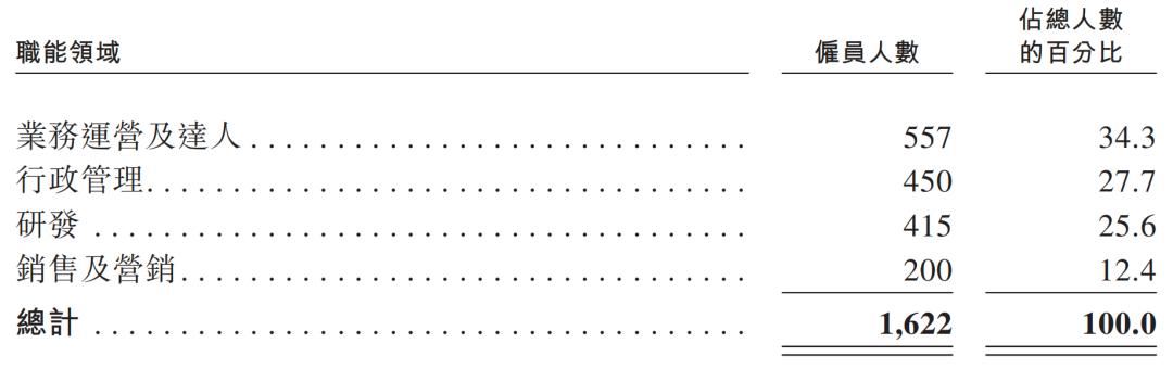 截至最后实际可行日期,钛动科技公司总人数为1622人。其中业务运营及达人占比最高达34.3%,为557人。