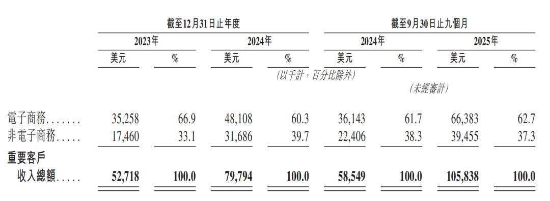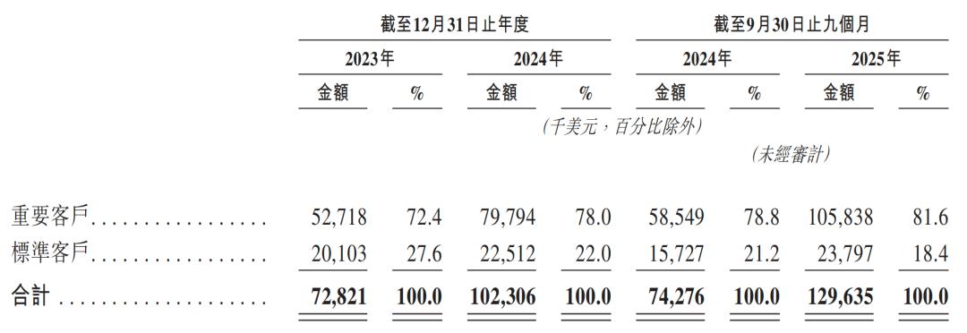 2023年、2024年及2025年前9个月,钛动来自前五大客户的合计收入分别为2890万美元、3750万美元及3420万美元,分别占其总收入的39.8%、36.7%及26.3%。