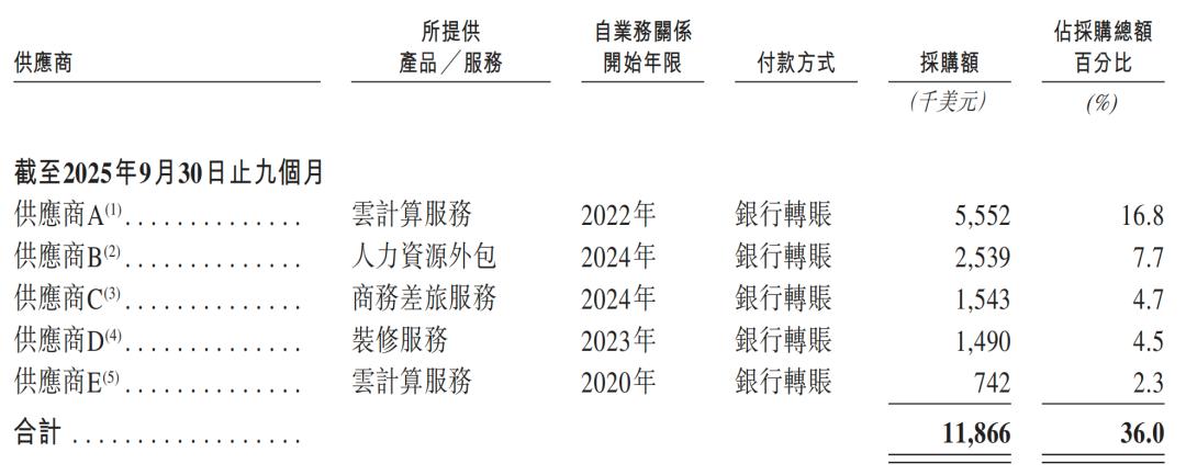 2023年、2024年及2025年前9个月,钛动向前五大供应商的合计采购额分别为300万美元、550万美元及1190万美元,分别占其采购总额的29.8%、29.4%及36.0%。