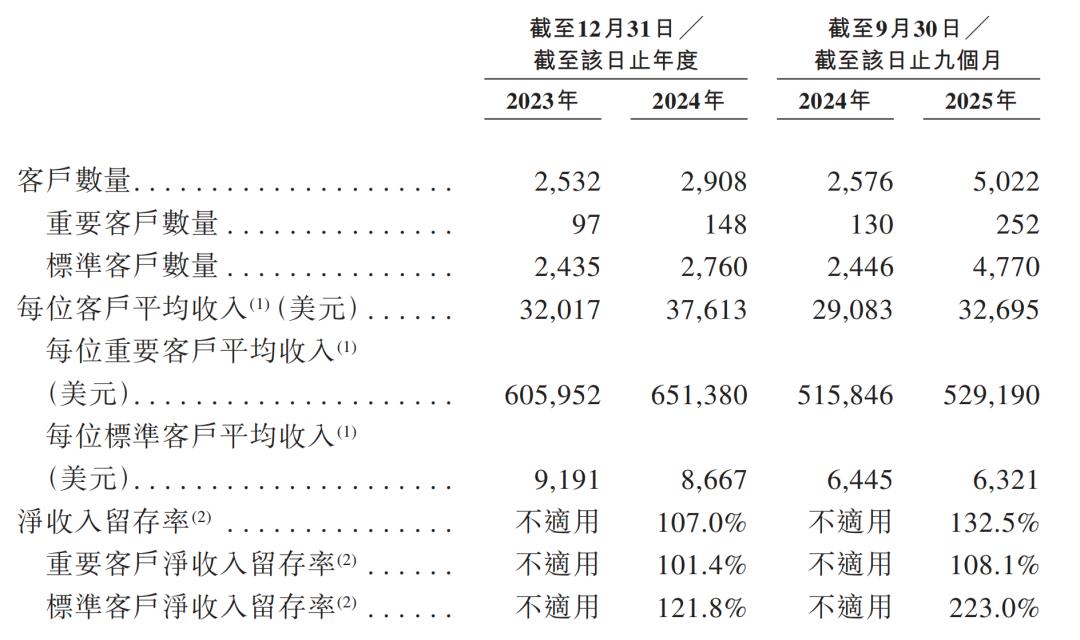 2025年前9个月,钛动科技总客户数达到5022个,其中重要客户数达到252个,为一整个财政年度收入贡献超过10万美元,或在截至2024年及2025年9月30日止九个月按比例贡献超过7.5万美元的客户;标准客户数达到4770个,为年度支出水平较低的客户。