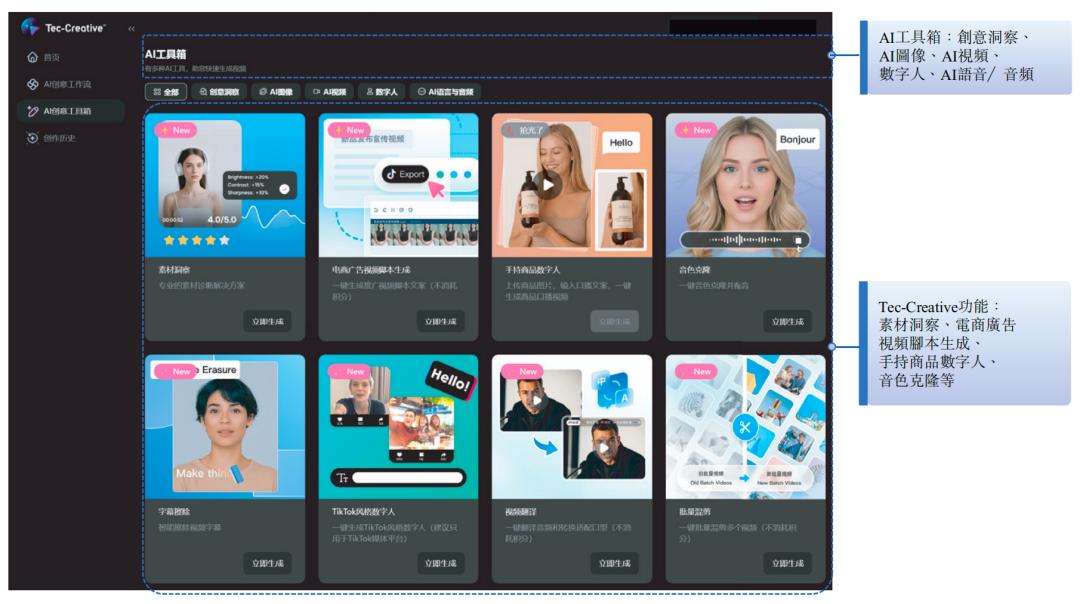 ▲Tec‑Creative功能模块涉及众多AI能力