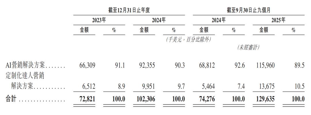 钛动科技的商业模式围绕两大互补的解决方案体系构建:AI营销解决方案及定制化达人营销解决方案。
