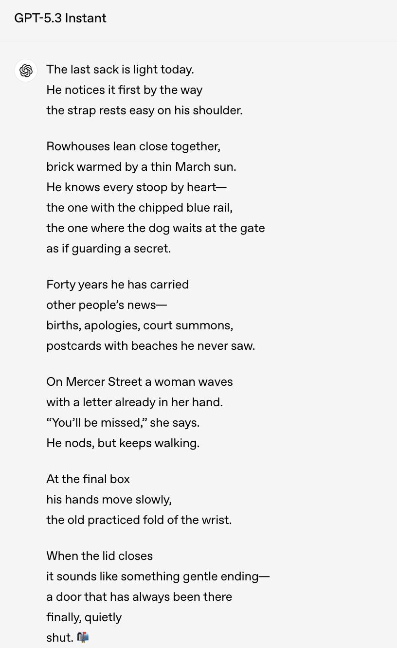比如,让模型以「费城一位退休邮递员最后一次送信」为题,写一首短诗。