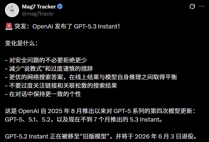 GPT-5.2 Instant保留三个月,6月3日退役。