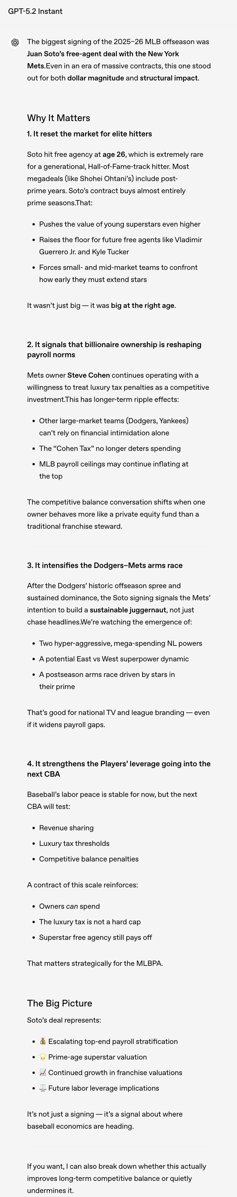 GPT-5.2 Instant回答的是上一年胡安·索托签约大都会的旧闻,分析框架没问题,但信息过时了。