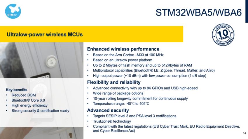 英飞凌(Infineon)对于Aliro 1.0也有贡献。早在2024年,Matter 1.4发布之际,英飞凌就曾在官网预告将与Aliro集成,允许通过Matter网络安装Aliro的门锁凭证,提升和升级占用传感器(Occupancy Sensing)。产品方面,包括PSoC套件、OPTIGA Trust M MTR 离散安全解决方案、AIROC CYW系列多协议SoC。