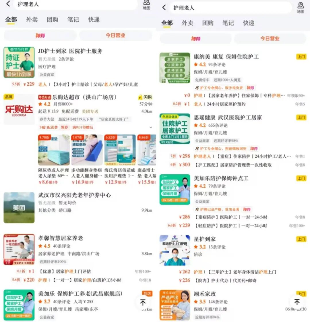 在美团搜索“护理老人” 图源美团搜索截图