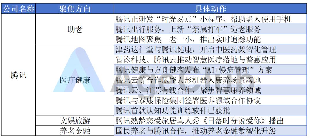 腾讯的布局较为全面,覆盖了助老、医疗健康、文娱旅游、养老金融等方向,展现出构建闭环生态的意图。